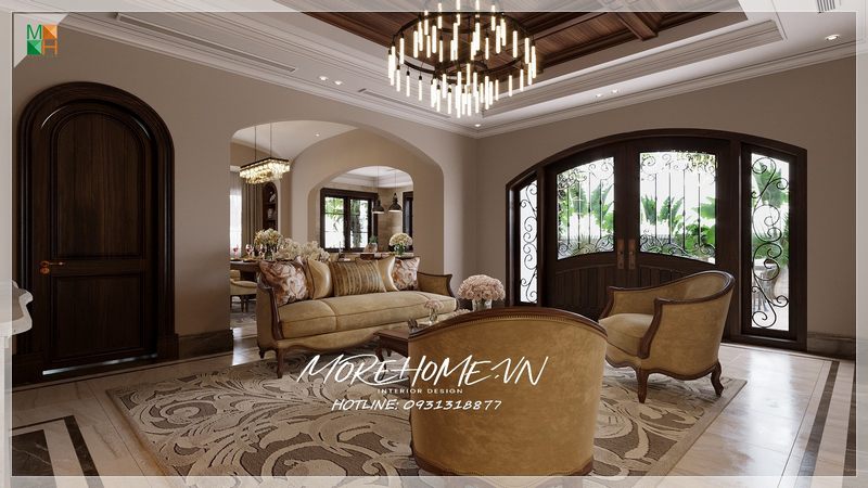 Hạng mục sofa gỗ óc chó tân cổ điển luôn là sản phẩm chủ đạo của không gian phòng khách, mang đến sự sang trọng, quý phái.