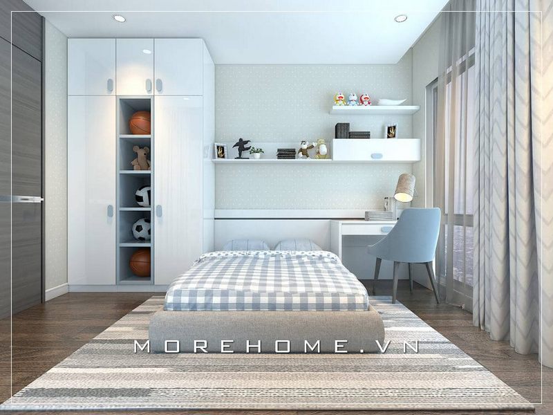 Mẫu tủ áo bé trai được thiết kế theo phong cách hiện đại kẻ hợp kệ tủ trang trí đầy ấn tượng