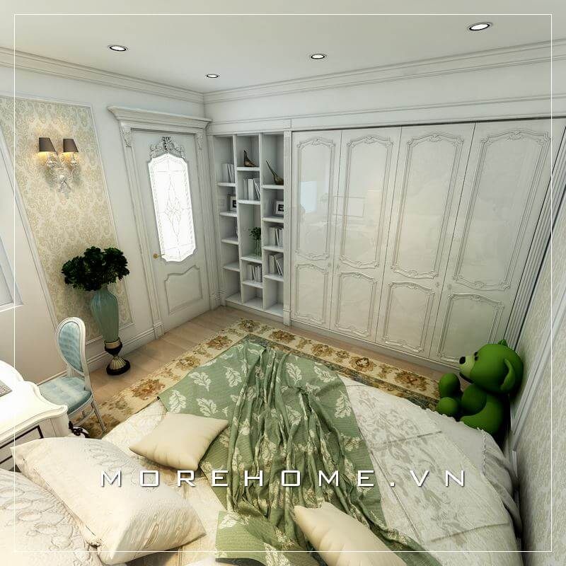 Tủ áo gỗ âm tường được thiết kế kịch trần, kết hợp kệ sách mang đến cho gia chủ sự tiện dụng nhất
