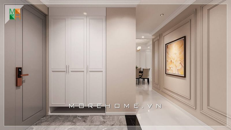 Mẫu thiết kế tủ quần áo màu trắng tân cổ điển rất tinh tế. Lối thiết kế kịch trần âm tường phù hợp cho không gian nội thất căn hộ chung cư, nhà phố, biệt thự,...