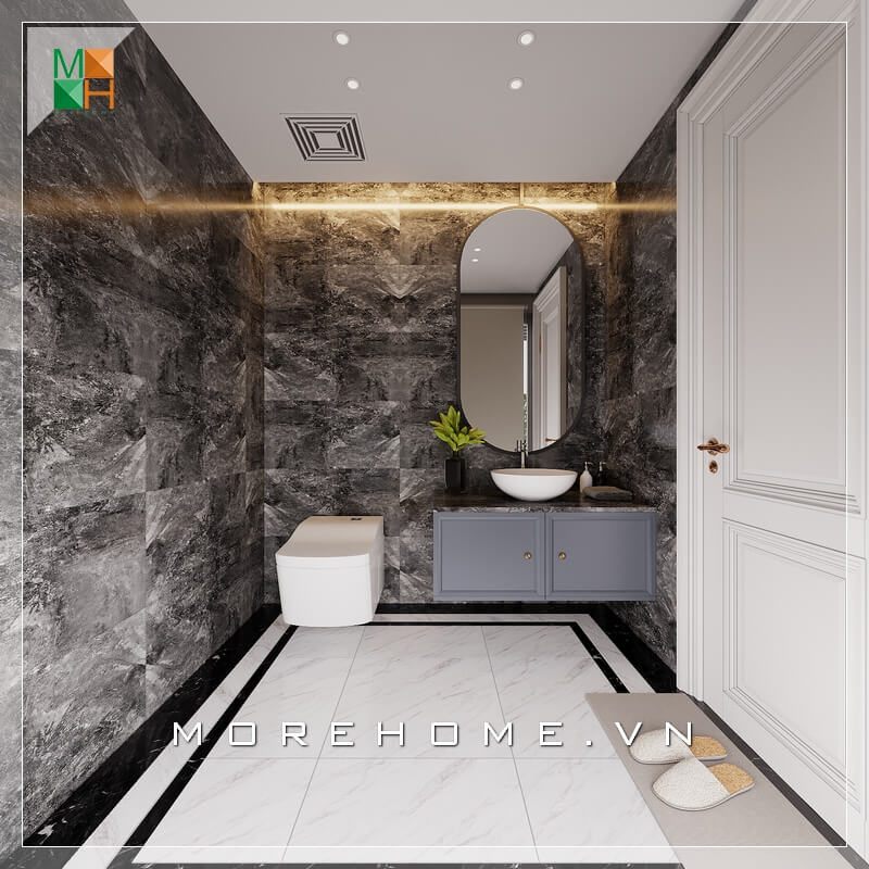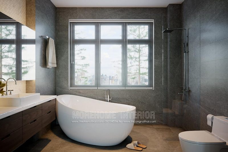 . Nếu bạn đang tìm kiếm một mẫu thiết kế phòng tắm đẹp, sang trọng với gam màu xám và chất liệu gỗ óc chó, thì ý tưởng thiết kế nội thất phòng tắm tại biệt thự Vinhomes Imperia Hải Phòng sẽ là một gợi ý khá ấn tượng.