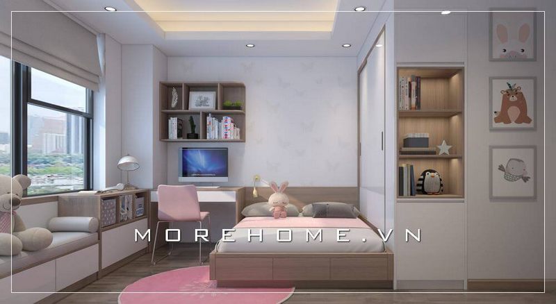 Việc lựa chọn và sắp xếp nội thất hợp lí, khoa học, chiếc bàn học tích hợp với chiếc giường đa năng có ngăn kéo, tủ quần áo âm tường cửa lùa, tạo nên bức tranh phòng ngủ đầy tiện nghi và thoáng đãng nhất